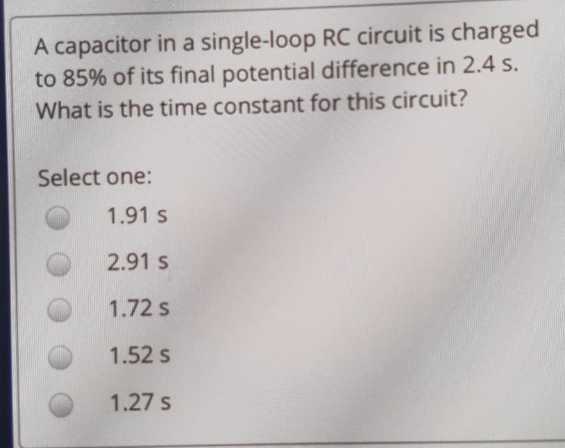 Find the time constant for the circuit. What is the time constant for this circuit. A capacitor in a single-loop RC circuit is charged to 85 of its final potential difference in 24 s.